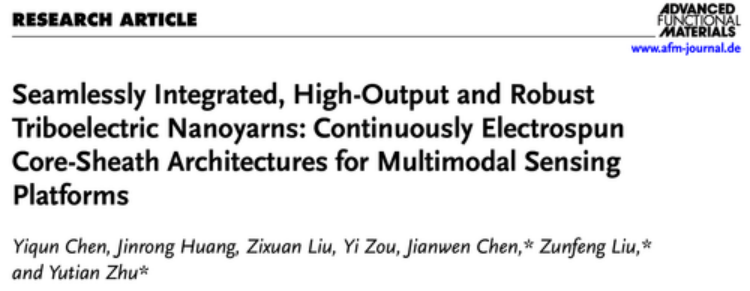 近日,我校九三学社社员、材料与化学化工学院朱雨田教授团队联合南开大学刘遵峰教授,在智能纤维传感与人机交互领域取得新进展。相关成果以《Seamlessly Integrated, High-Output and Robust Triboelectric Nanoyarns: Continuously Electrospun Core-Sheath Architectures for Multimodal Sensing Platforms》为题,发表在国际知名期刊《Advanced Functional Materials》(IF:19,2025)上。